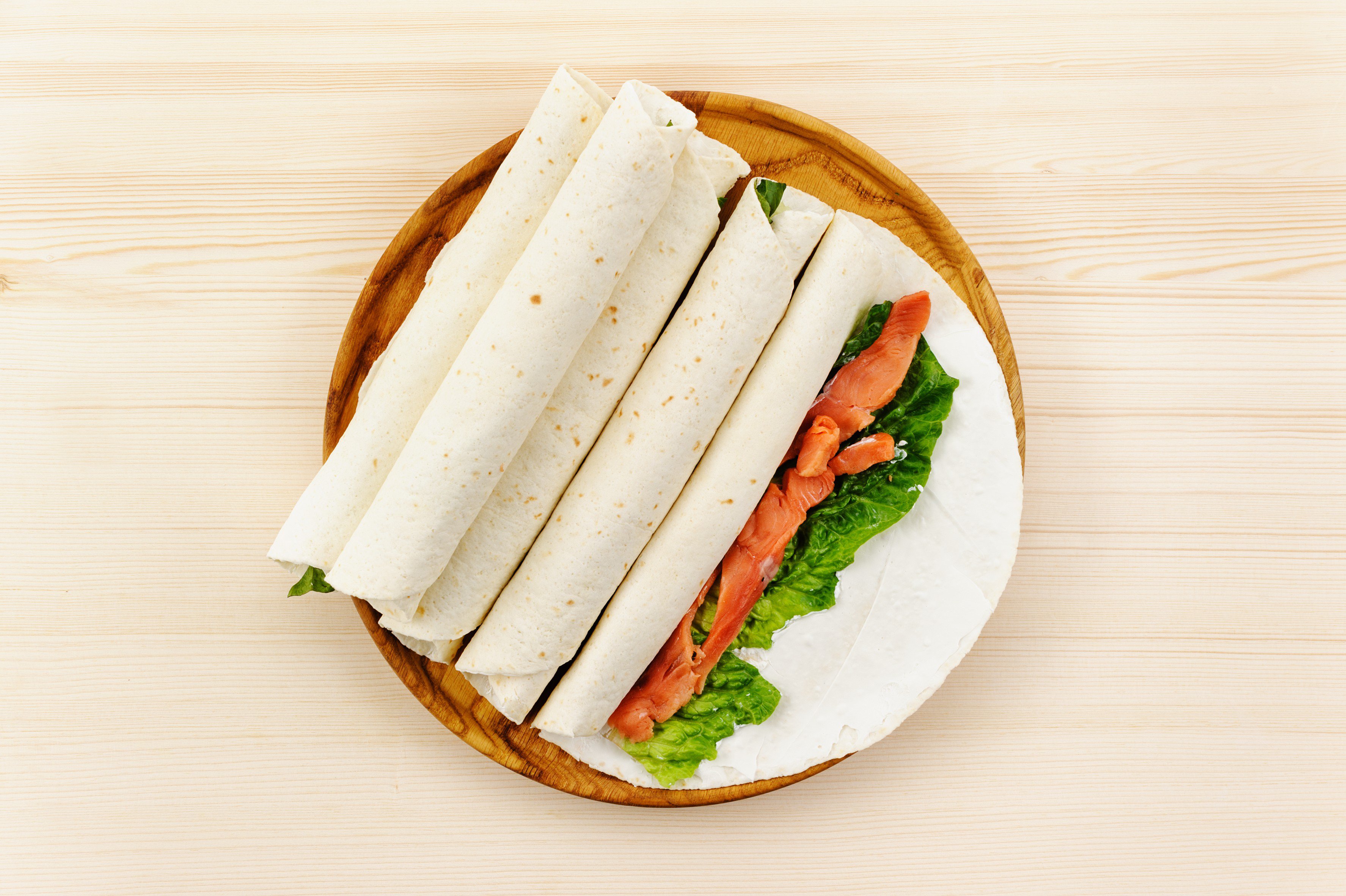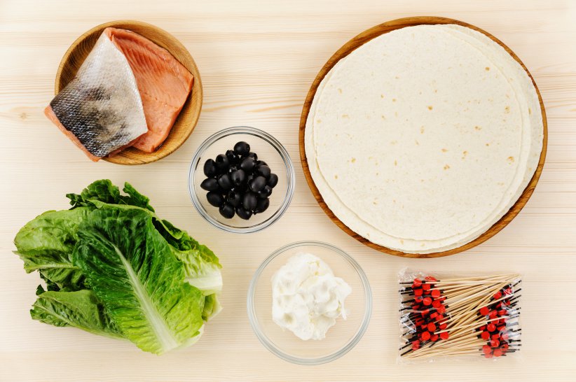 Тортилью равномерно смажьте сливочным сыром, выложите листья салата и ломтики рыбы.