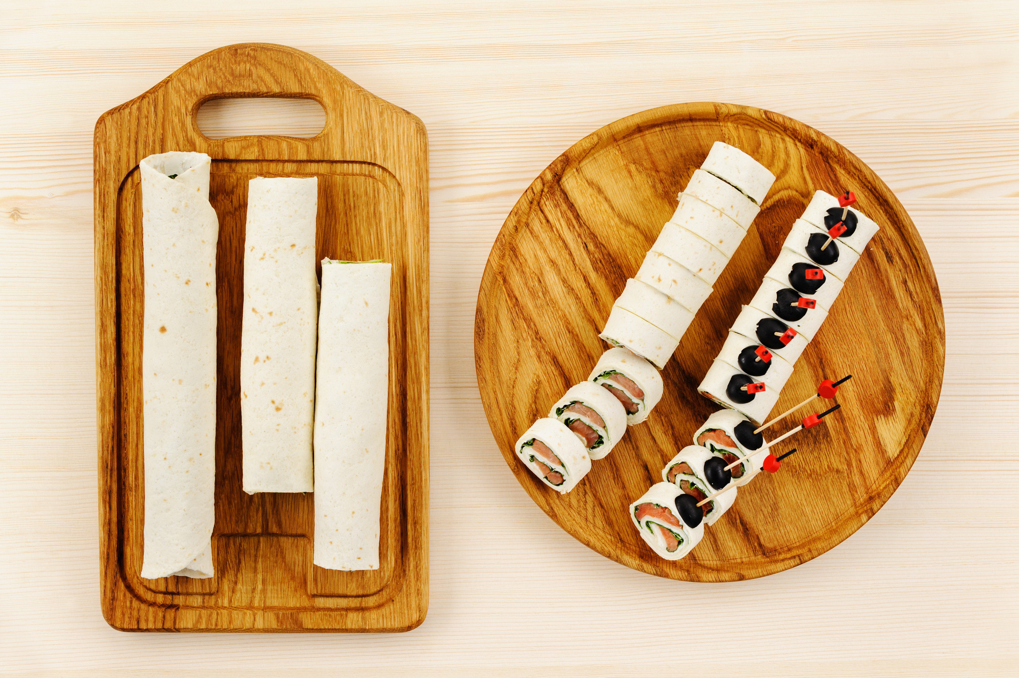 У каждого готового рулета обрежьте края и разрежьте на 10 равных частей. Каждый рулетик украсьте половинкой маслины, закрепите шпажкой и выложите на тарелку.