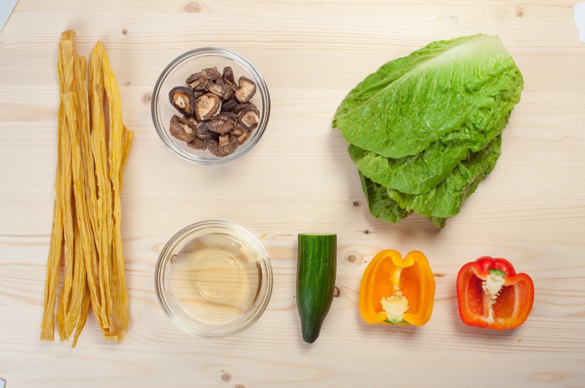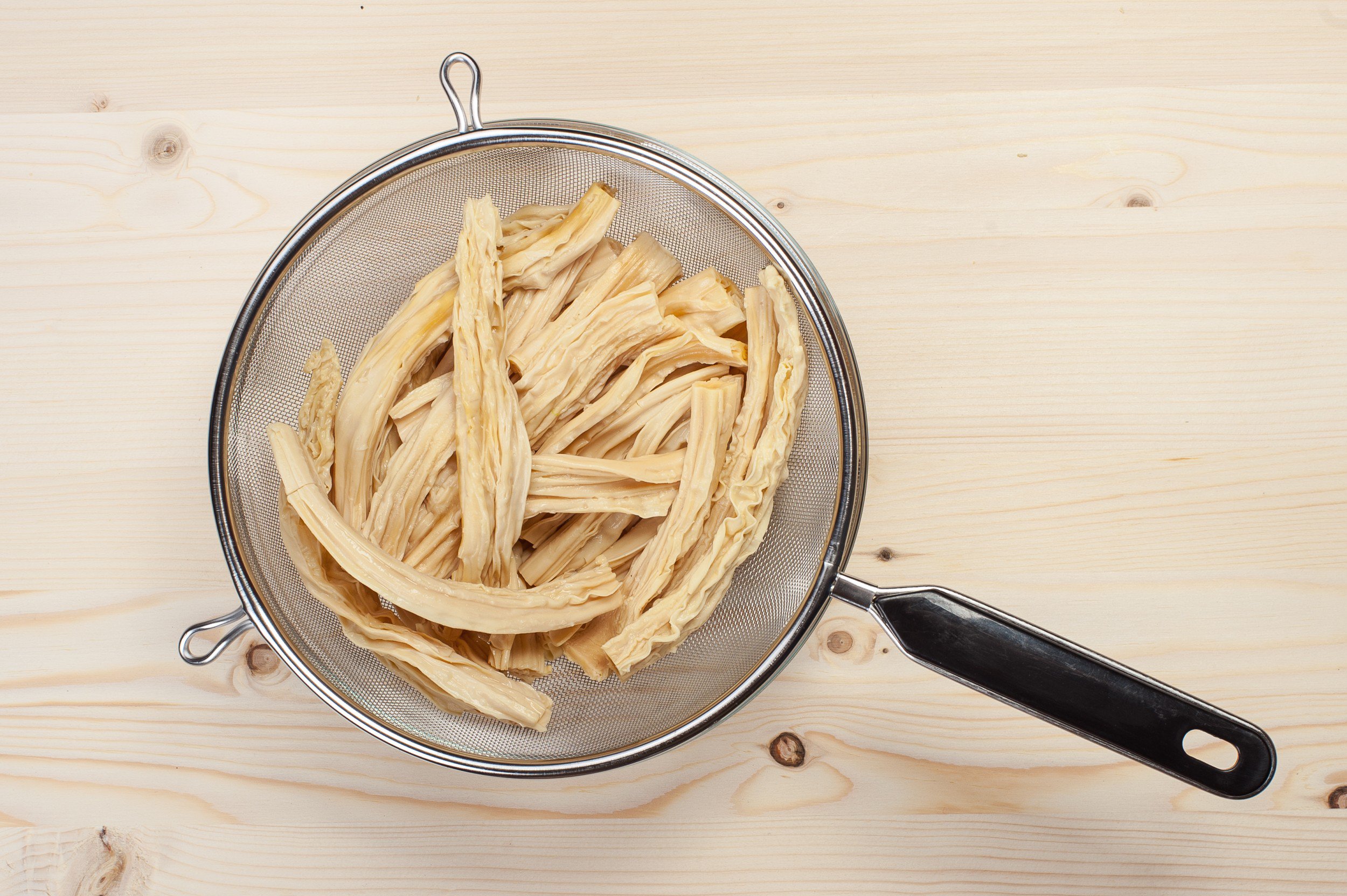 Соевую спаржу Фучжу разломите на небольшие кусочки и замочите в теплой подсоленной воде на 1 час до набухания. Откиньте на дуршлаг и дайте стечь лишней жидкости.
