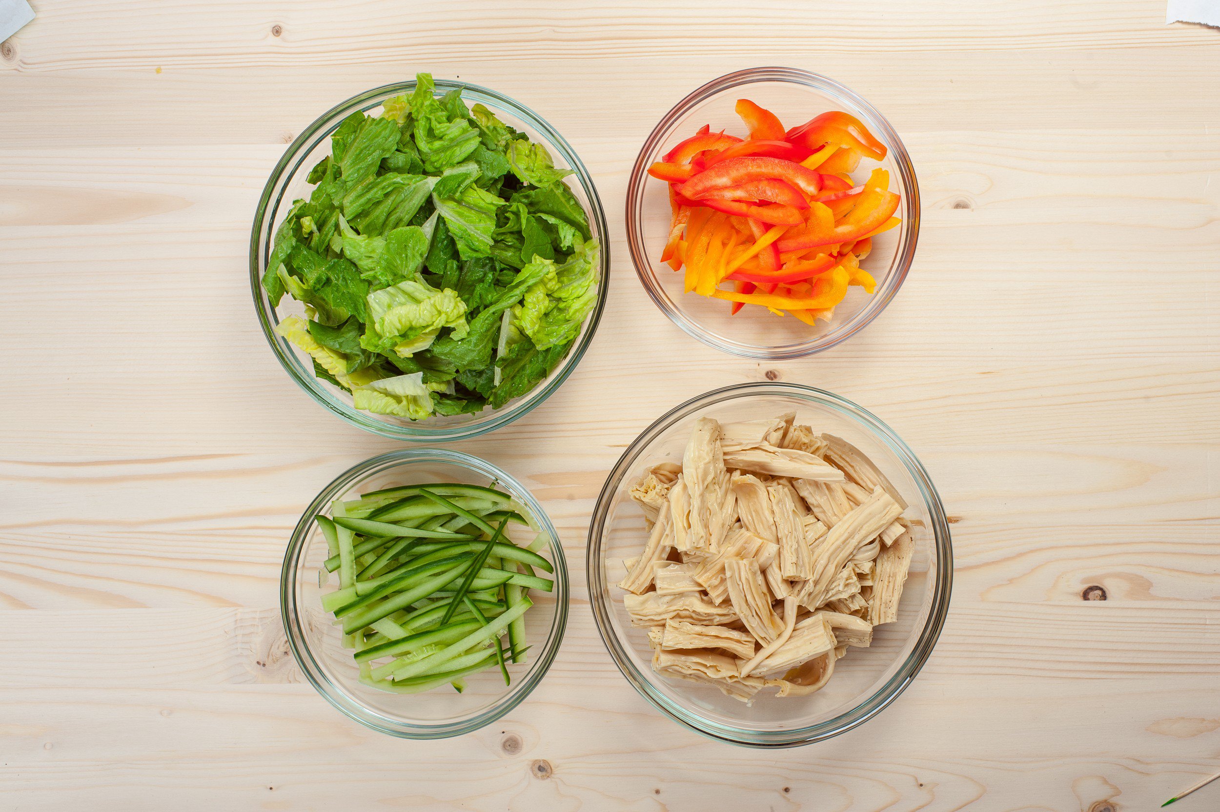 Нарежьте огурцы и болгарский перец тонкой соломкой. Фучжу нарежьте брусочками, салат Романо нарвите на кусочки размером примерно 3х3 см, удалив кочерыжки.