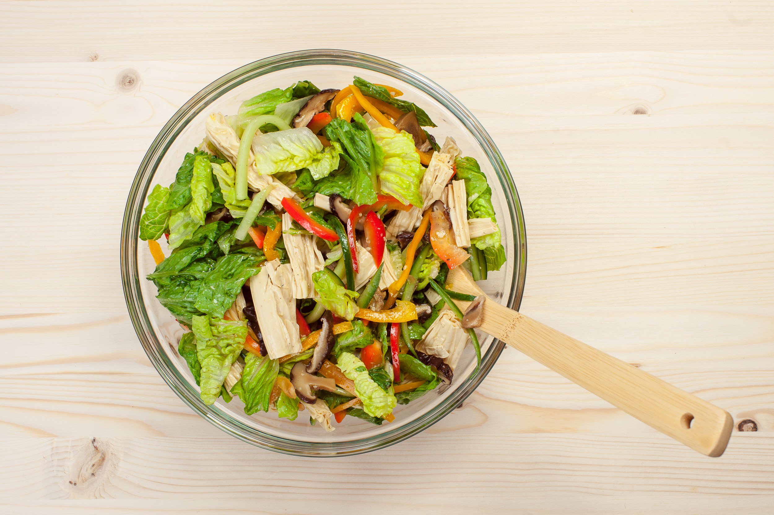 Соедините все нарезанные ингредиенты, добавьте нарезанные ломтиками Шиитаке, заправьте соусом и хорошо перемешайте.