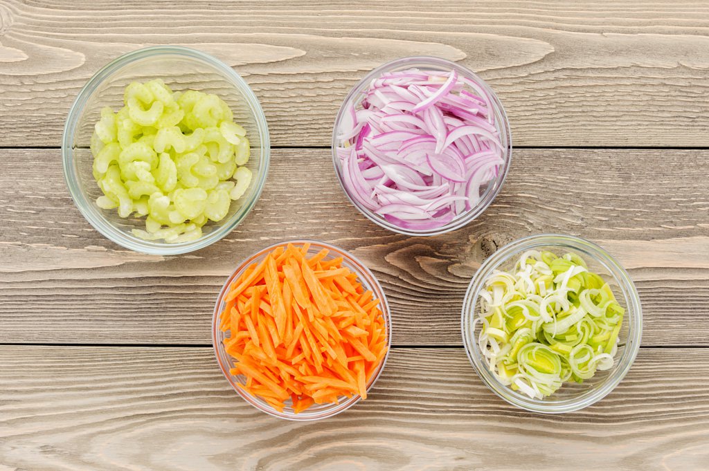 Все овощи помойте, красный лук и морковь очистите. Оба вида лука нарежьте полукольцами, а морковь и сельдерей - тонкой соломкой.