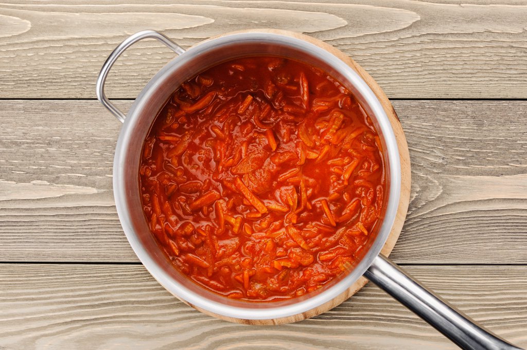 Затем влейте к обжаренным овощам сок от консервированных томатов и 400 мл воды (при приготовлении на 2 персоны), дайте закипеть и варите на медленном огне 30 минут.