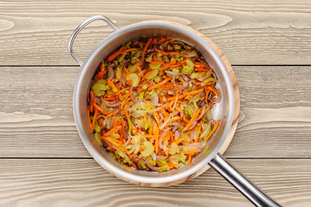 В сотейнике разогрейте половину оливкового масла(вторая понадобится для подачи готового блюда) и обжарьте подготовленные овощи до золотистого цвета.