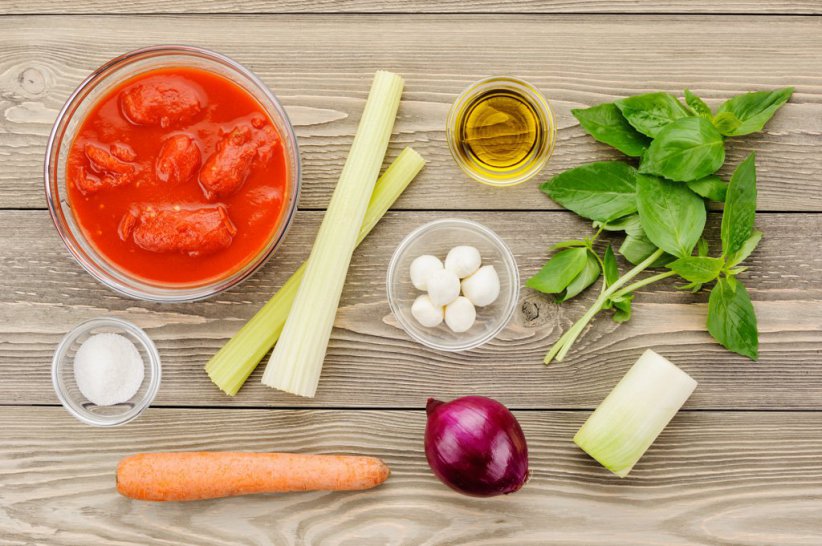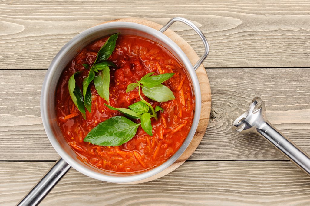 Влейте в сотейник сок от консервированных томатов, а сами томаты мелко порубите ножом и забросьте в суп, добавьте половину базилика (вторая понадобиться для украшения) и все вместе измельчите погружным блендером до однородной консистенции.