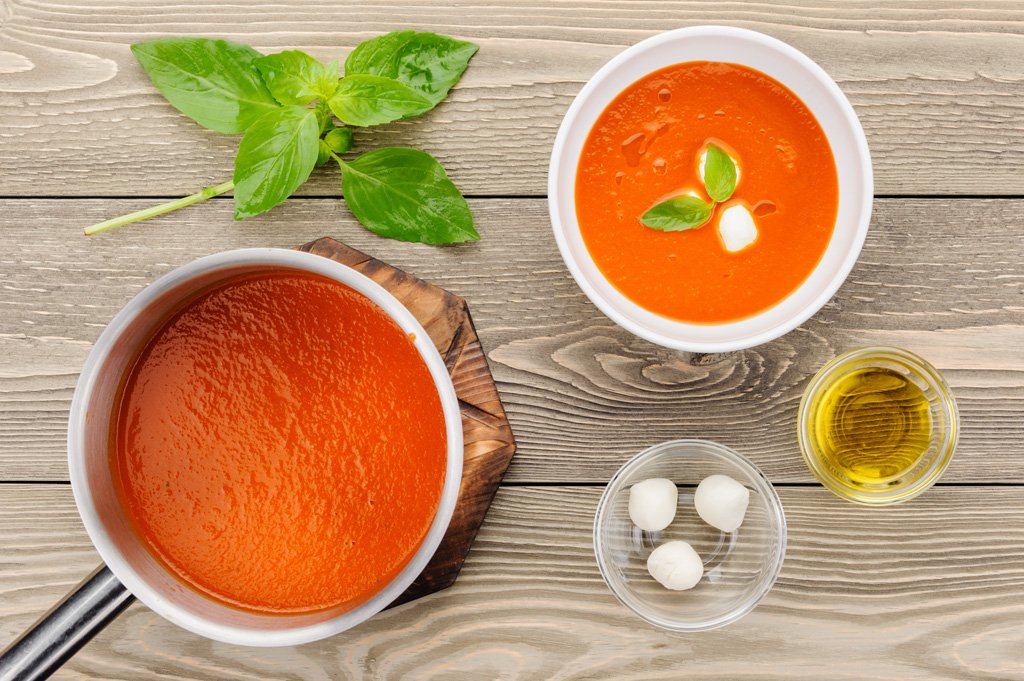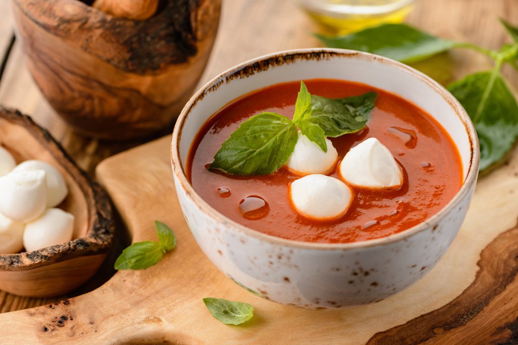 Разлейте суп по тарелкам, добавьте в каждую по несколько шариков Моцареллы, украсьте листиками свежего базилика и сбрызните оливковым маслом.
