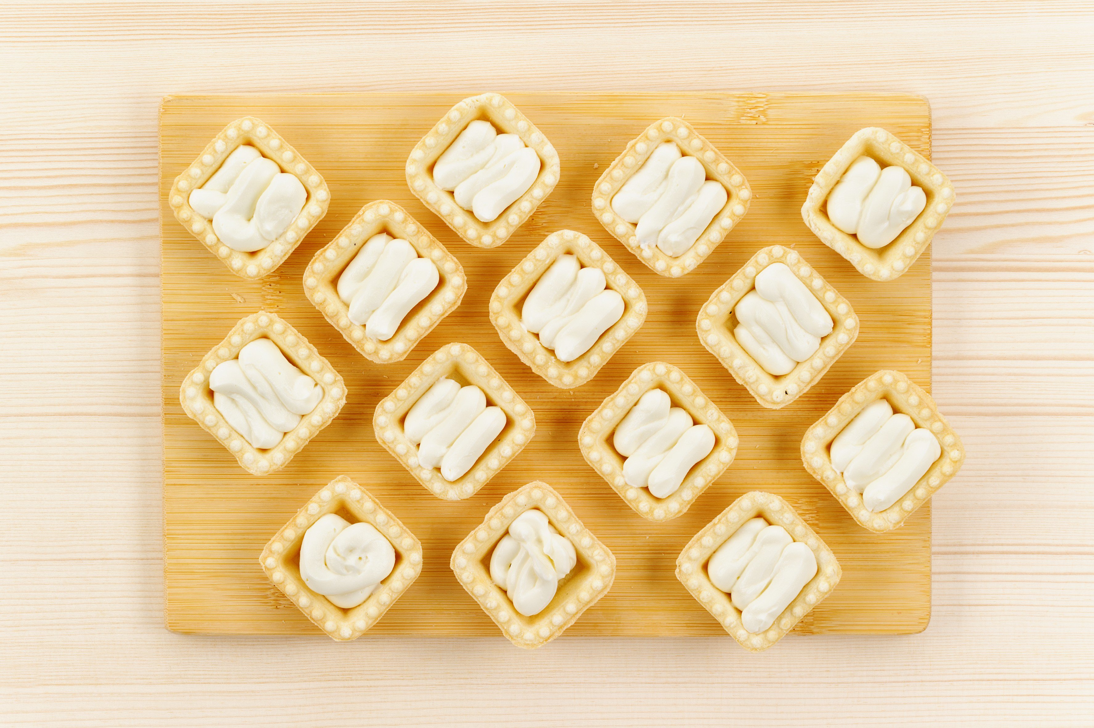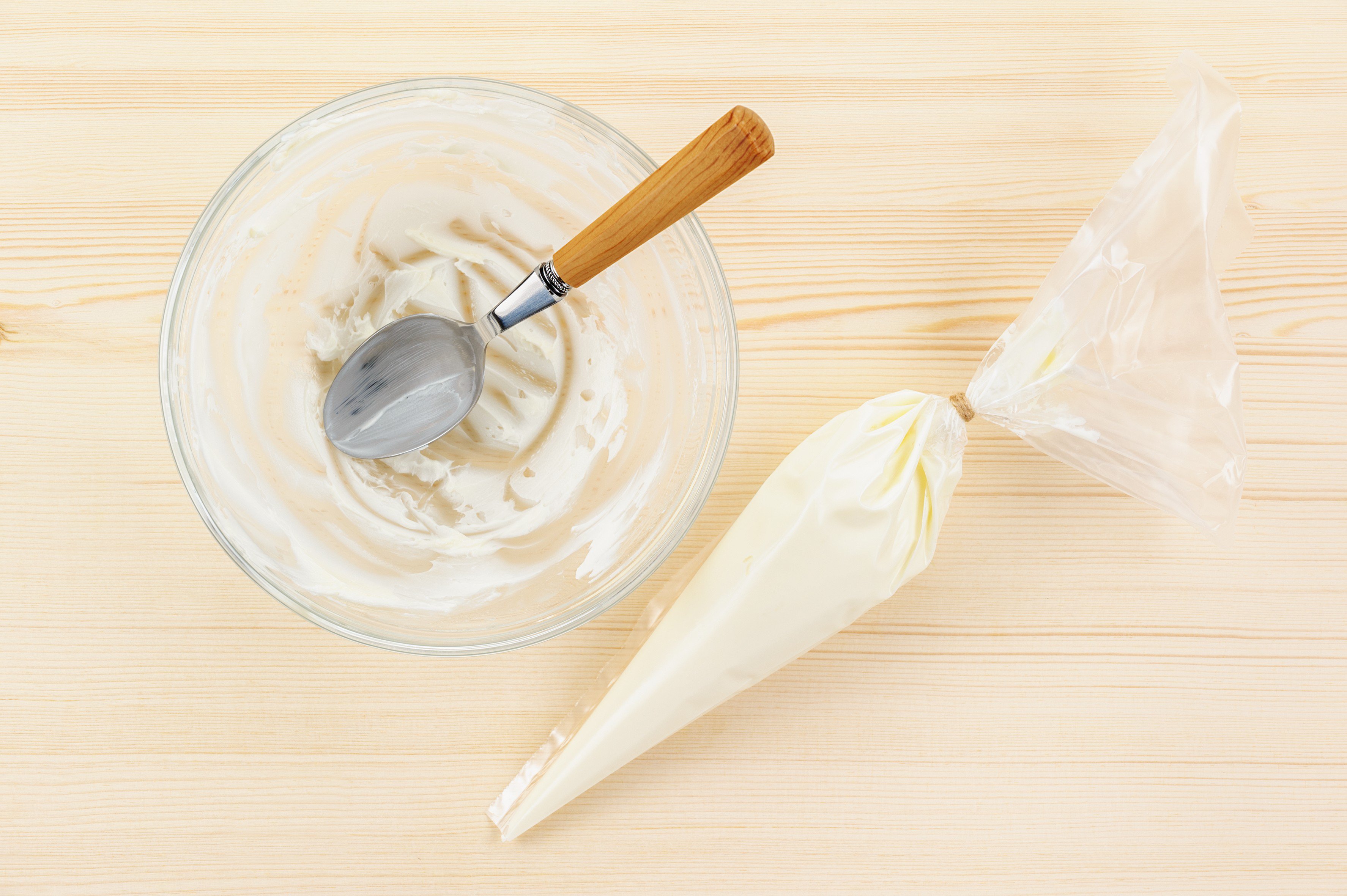 Приготовьте крем: творожный сыр взбейте миксером, добавьте ванильный сироп и сахарную пудру. Крем переложите в кондитерский мешок.
