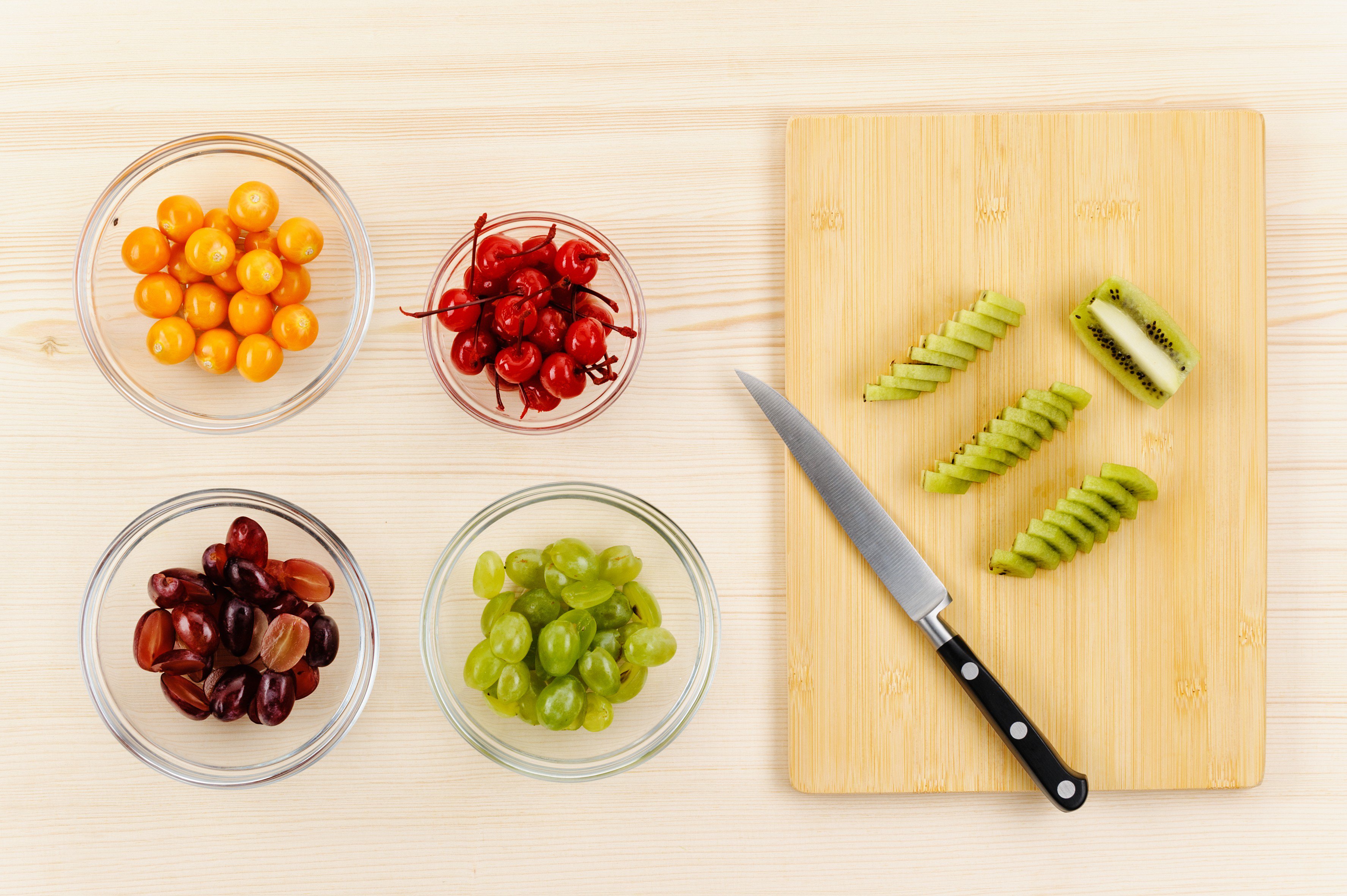 Подготовьте фрукты: киви очистите, разрежьте на 4 части, затем нарежьте на дольки. Виноградины разрежьте пополам. Физалис очистите от чашечек, с вишен слейте сироп.